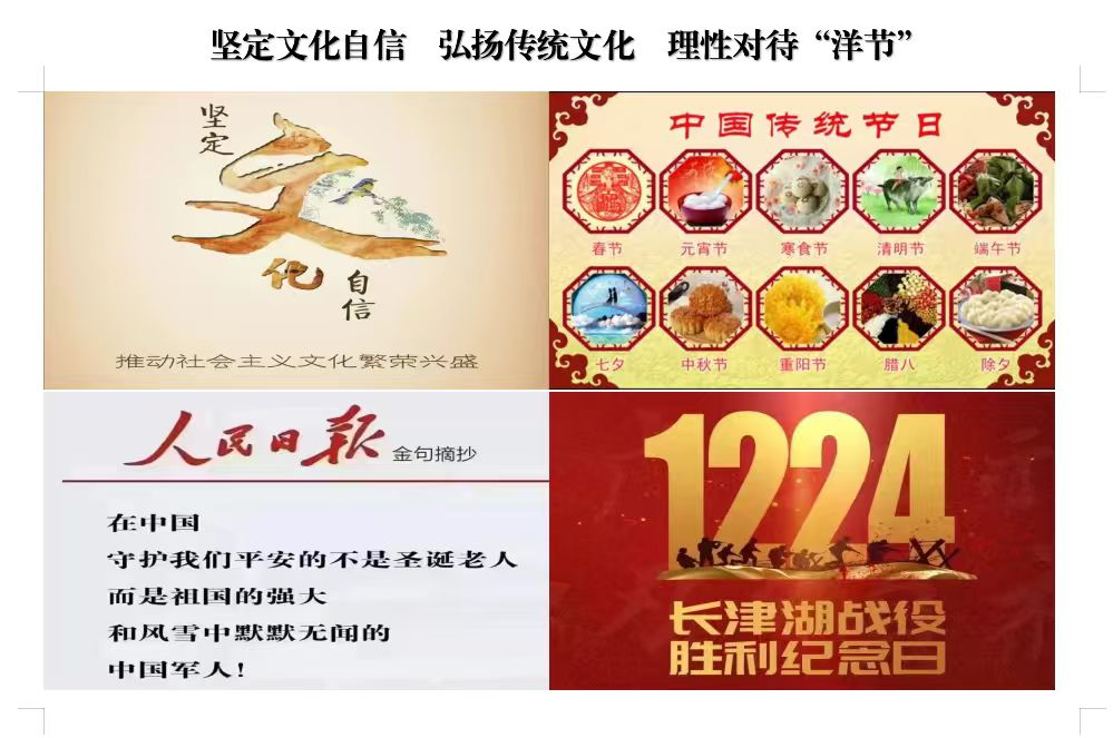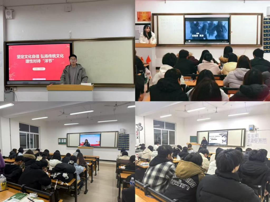 为进一步引导青年学子厚植家国情怀,筑牢民族文化根基,树立正确的文化认知导向。12月21日晚,球盟会组织各班级召开“坚定文化自信 弘扬传统文化 理性对待‘洋节’”主题班会。各班积极响应,结合班级特色策划开展了形式多样的活动,或分享传统节日典故,或组织传统习俗体验,让同学们在互动中加深 对中华传统文化的理解与认同。